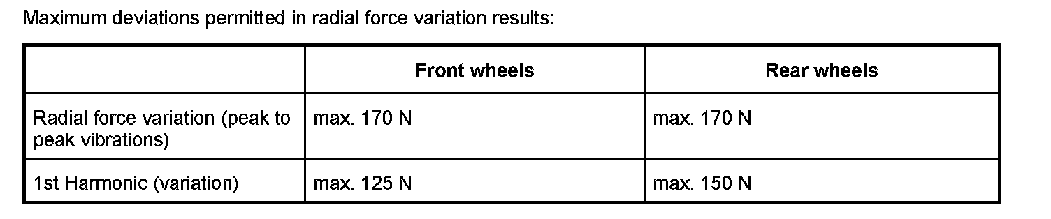 A new tire must be fitted if the radial force variation cannot be reduced to the values listed in the table.
