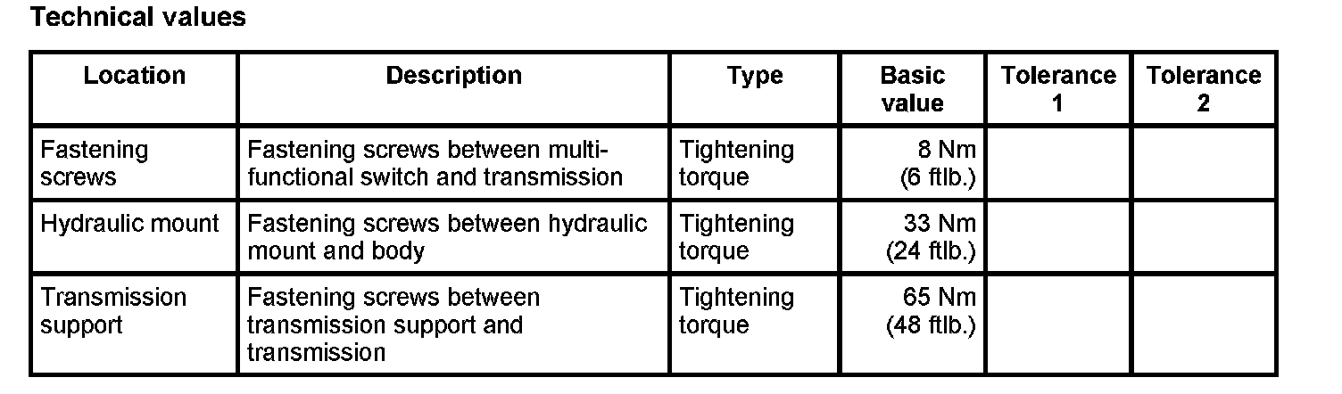 The fastening nuts of the transmission support must never be loosened at the hydraulic mount because otherwise the transmission brackets will be damaged.