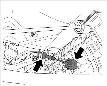 5. Screw in fastening screws between the body and the hydraulic mount -arrows-.