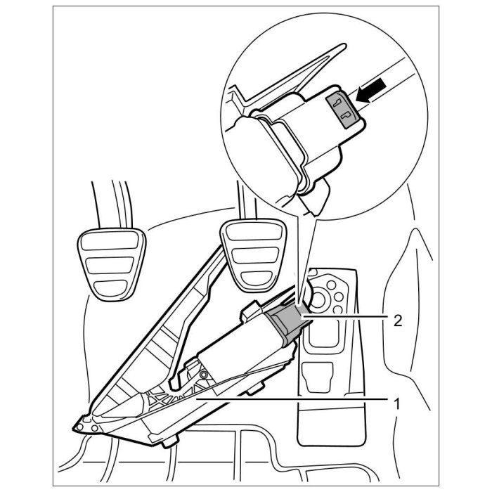 Slide electric connector -2- back onto the accelerator pedal as far as the locking point until the locking mechanism -1- releases and locks the connector -2- in position again.
