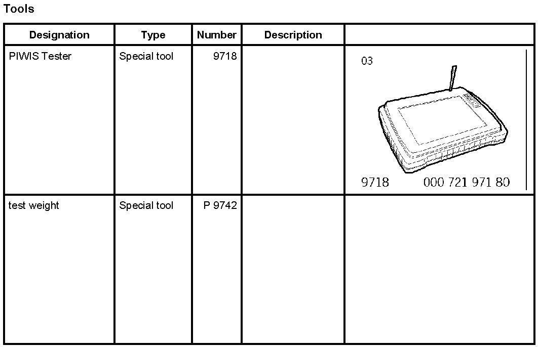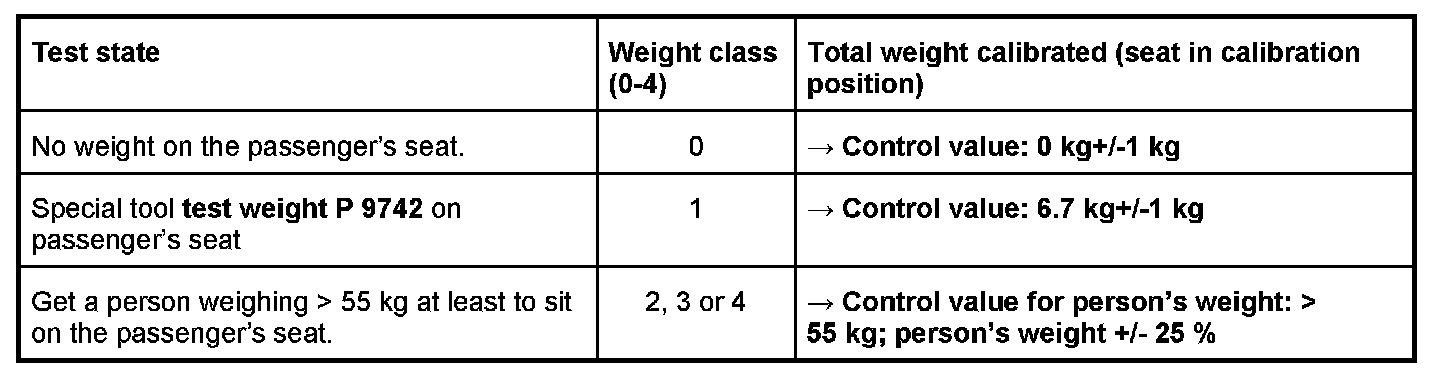 10.1.2. Place the special tool test weight P 9742 on the passenger's seat. The Passenger Airbag Off indicator light in the centre console must come on. Compare values (see table below) using the PIWIS Tester.