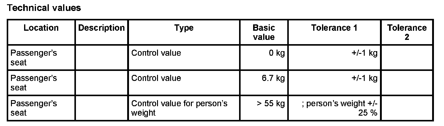 10.1.1. If there is no weight on the passenger's seat, compare values (see table below) using the PIWIS Tester. The Passenger Airbag Off indicator light in the centre console must not come on.