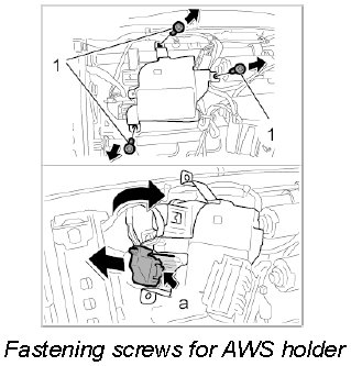 3. Release electric connector on AWS control unit -a-, unplug and tilt the AWS holder to the right side.