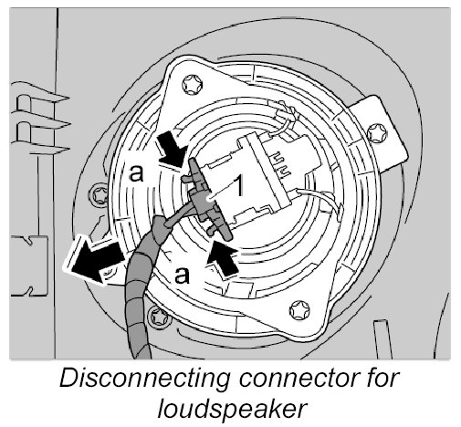 3. Press locking tabs together -Arrows a- and disconnect connector for loudspeaker -1-.