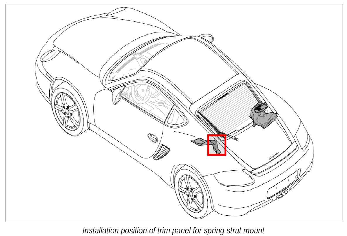 3. Align gap of trim panel for spring strut mount -2- to shelf and tighten fastening screws -1-. Tightening torque: 1.5 Nm (1.0 ftlb.)