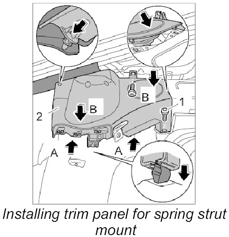 2. Insert trim panel for spring strut mount -2- in the side trim panel -Arrows A- and press down until the clamps engage -Arrows B-.
