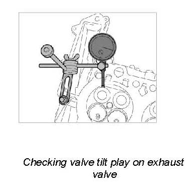 3. Check valve tilt play on exhaust valve. Adjust the dial gauge to the relevant angle of the valve to be checked and set to '0' with preload. Press valve disc towards dial gauge and pull it back again. Read off value and note it.