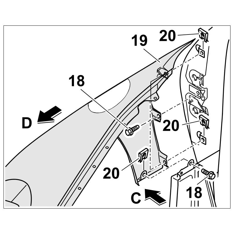 3. Position wing -19- on the body -C- and slide towards A-pillar -D-. Screw in fastening screws -18- into the A-pillar and tighten lightly.