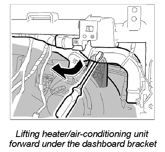 13. Carefully lift heater/air-conditioning unit forward with a screwdriver under the right side of the dashboard bracket.