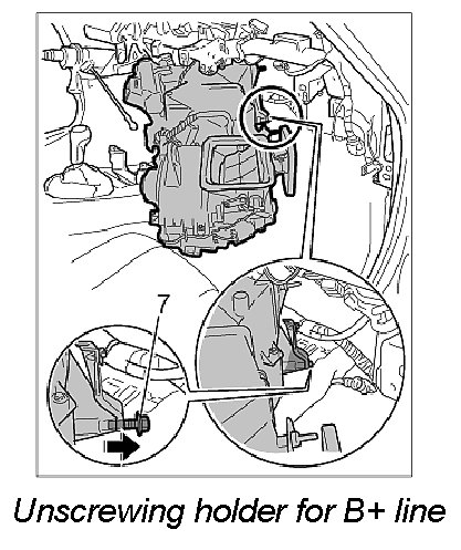 17. Pull air conditioner forward on the right side, unscrew fastening screw -7- for B+ line holder and remove holder for heater/air-conditioning unit.