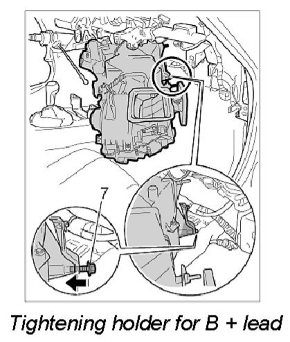 3. Position holder for the B+ line on the heater/air-conditioning unit and tighten with the fastening screw -7-. - Tightening torque: 1.7 Nm (1.5 ftlb.)