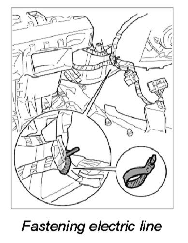 4. Lay electric line from vehicle wire harness to heater/air-conditioning unit wire harness and fix with a tiewrap.