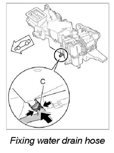 7. Check water drain hose for damage; if drain hose shows no sign of damage, connect hose to the drain on heater/air-conditioning unit and fix with the clamp -C-.