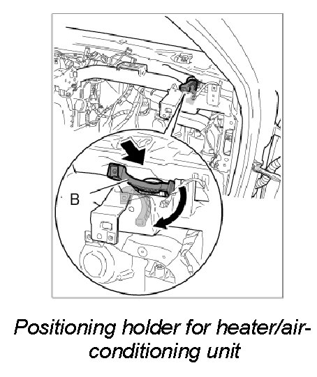 9. Guide holder -B- for the heater/air-conditioning unit over the dashboard bracket, push through the mounting of the heater/air-conditioning unit and turn through 90°.