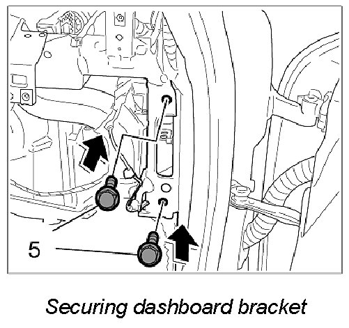 7. Unscrew the two fastening screws -5- for dashboard bracket to right side of body.