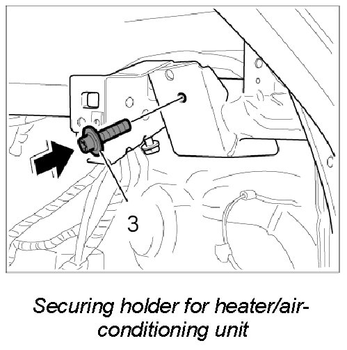 5. Unscrew fastening screw -3- for securing holder of the heater/air-conditioning unit to right side of dashboard bracket (next to A-pillar).
