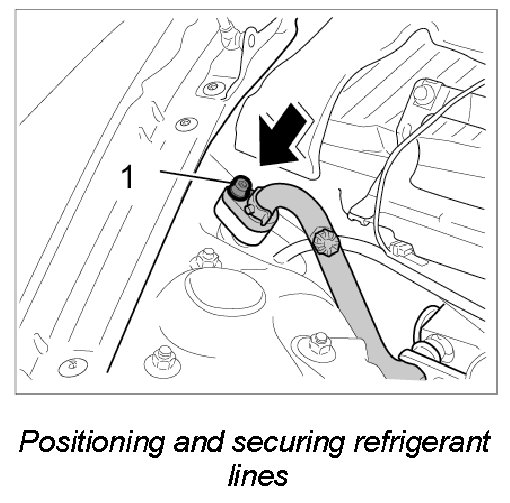 18. Replace sealing rings for refrigerant lines and wet with refrigerant. Position refrigerant line and tighten with fastening screw -1-. - M8: 14 Nm (10.5 ftlb.)