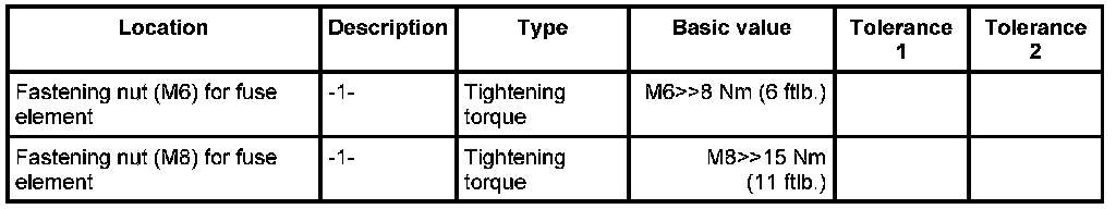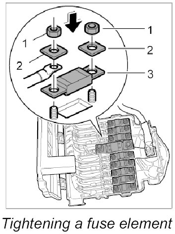 3. Place the fuse element -3- into position, fit the washer -2- and secure with the fastening nuts -1-. - Tightening torque: M6>>8 Nm (6 ftlb.) - Tightening torque: M8>>15 Nm (11 ftlb.)