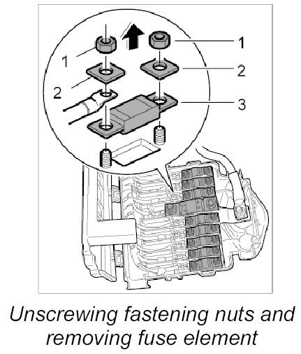 2. Unscrew the fastening nuts on the faulty fuse element -1-, remove the washer -2- and take out the fuse element -3-.