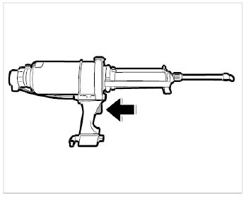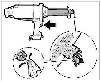 4.1. By activating the valve -arrow- allow the pressure piston to move out slowly until both components of the adhesive are visible at the mixing nozzle.