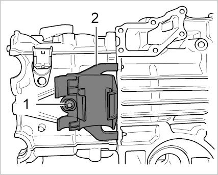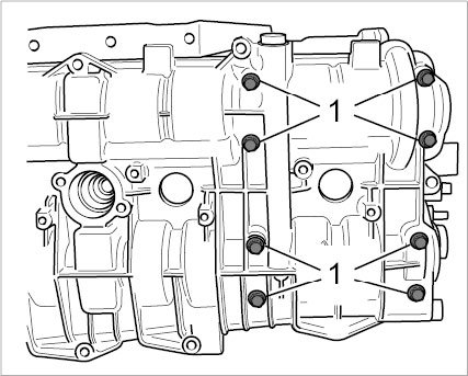 26. Fit cylinder head cover. Eight new, coated screws -1- must be used for the threaded joints on the camshaft bearing surfaces. For each one, tighten 20 M6 fastening screws according to the tightening sequence. Of each of the sets of 20 screws, only position two screws on the oil suction side (or tandem pump) and only perform the final tightening after fitting the pumps -> Tightening torque: 13 Nm (9.5 ftlb.).