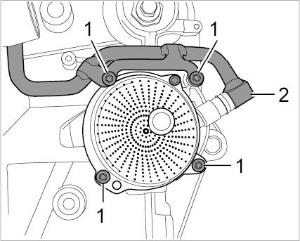 5. Fit air/oil separator (swirl pots) and suction pipe. Replace two micro-self-locking M6 x 20 Torx screws and O-rings for the suction tube. -> Tightening torque: 10 Nm (7.5 ftlb.)