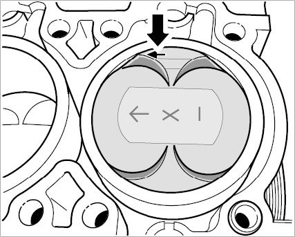 67. Remove all carbon deposits and other residues on all six pistons with a brass brush, which will make the engraved markings -arrow points to flywheel side- visible. Before removing, number and mark the pistons in the installation position.