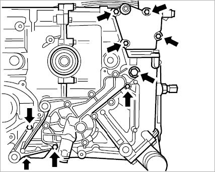73. Remove coolant pump. Unscrew seven hexagon-head bolts (two M6 x 30 and five M6 x 25) and remove pump.
