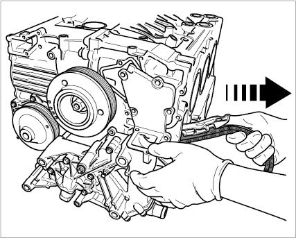 75. Remove coolant guide housing and oil pump. Unscrew ten Torx screws, namely eight M6 x 20 and two M6 x 70, and carefully lift off housing with seal (press lightly with an assembly lever if necessary). Pull out the driver for the oil pump. Remove the drive belt guide in Tiptronic vehicles.