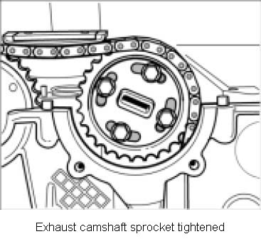 17. Insert four Torx screws M6 to sprocket of exhaust camshaft and tighten evenly in diagonally opposite sequence. Tightening Torque: 10.5 ft. lb.