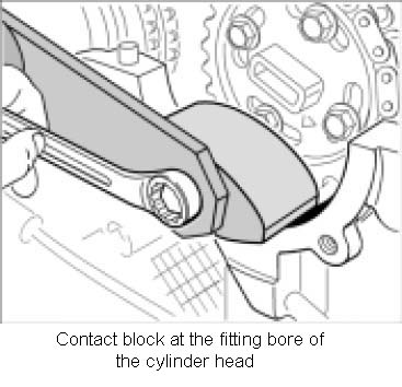 18. Tighten the central screw of the camshaft adjusting device. Fit special tool retaining tool 9685 on hexagon of intermediate piece of the central screw. Screw in the central screw gently by hand so that the loose contact block just touches the fitting bore of the oil suction pump. Fix the hexagon-head bolt to the contact block.