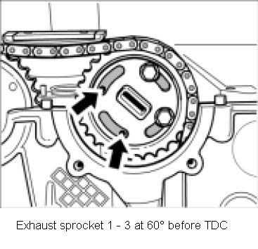 28. Insert exhaust camshaft sprocket in the timing chain and position on camshaft flange. The four threaded bores in the camshaft flange must be fully visible on the left at the slotted curves of the sprocket-arrows- so that the Torx screws M6 12 can still be positioned to fasten the sprocket.