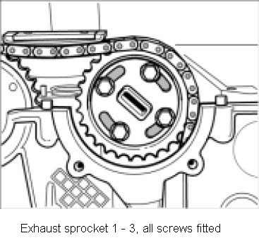 10. Unscrew four Torx screws for exhaust camshaft sprocket. Lift timing chain off sprocket and remove the sprocket. Lay timing chain on the mounting tab for the sprocket.
