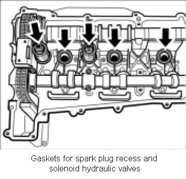 1. Insert solenoid hydraulic valves and new gaskets for the spark-plug recesses. Fit new O-rings into both solenoid hydraulic valves and insert into the bores in the cylinder head. Grease O-rings with Optimol MP3.