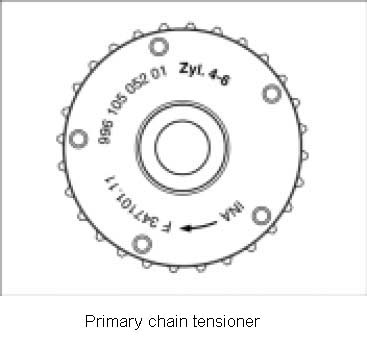 - Primary chain tensioner on crankcase (oil filter area), identification: one ring-arrow-