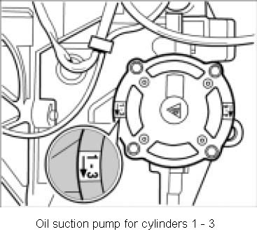 9. Remove oil suction pump for cylinders 1 - 3. Unscrew four Torx screws M6 20 (micro-self-locking), remove oil suction pump, and replace O-ring and screws.