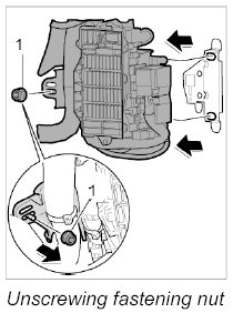 2. Unscrew the fastening nut -1- , pull the fuse box forward and disengage it from the support.