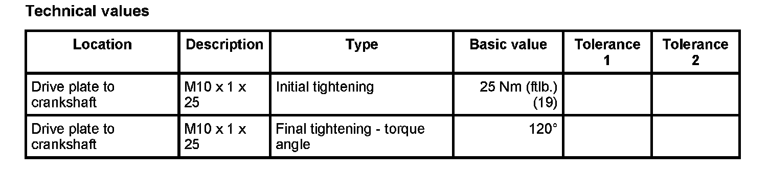 3. Screw in and tighten fastening screws in diagonally opposite sequence. - Initial tightening: 25 Nm (ftlb.) (19); - Final tightening - torque angle: 120 degrees