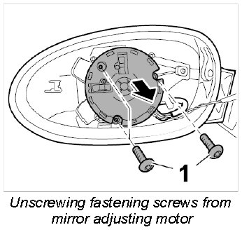 2. Unscrew the three fastening screws -1- from mirror adjusting motor.