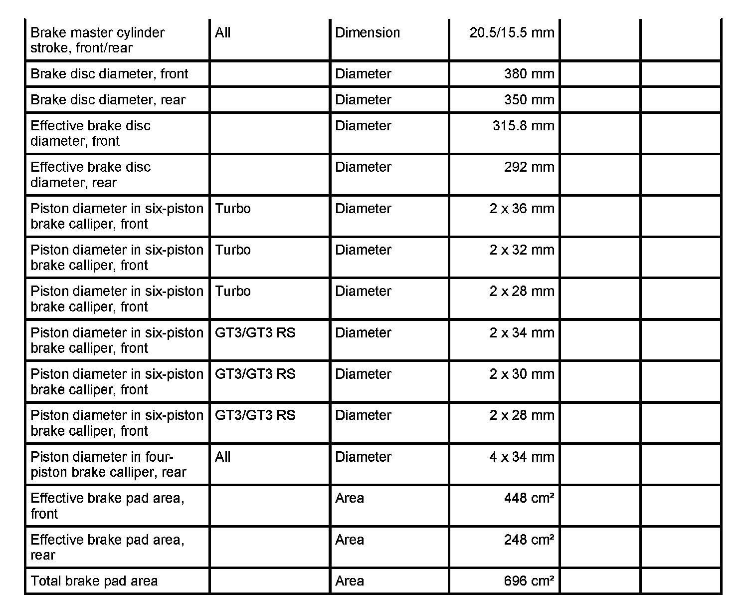 Technical data for 911 Turbo/GT3/GT3 IRS - PCCB brakes (option)