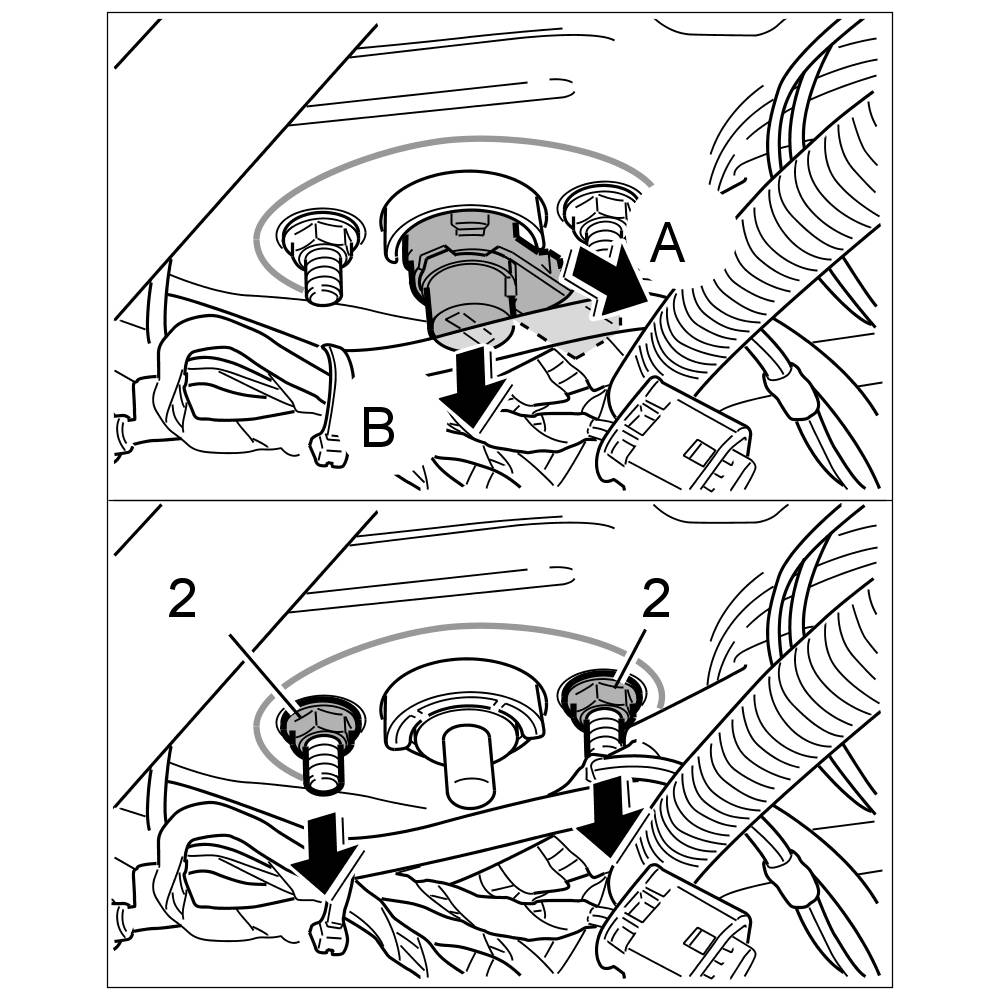 2. Release the locking mechanism of the B+ line -A- and pull off the B+ connection from the power distributor -B-.