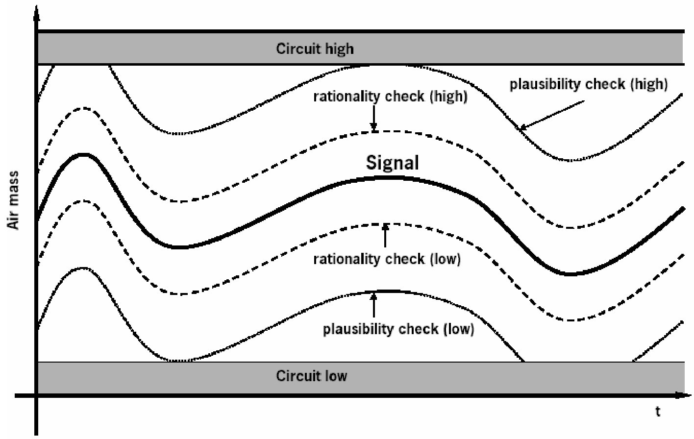 If the output voltage of the air mass meter is above a threshold value, a fault is detected.If the output voltage of the air mass meter is lower than a threshold value, a fault is detected.