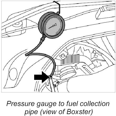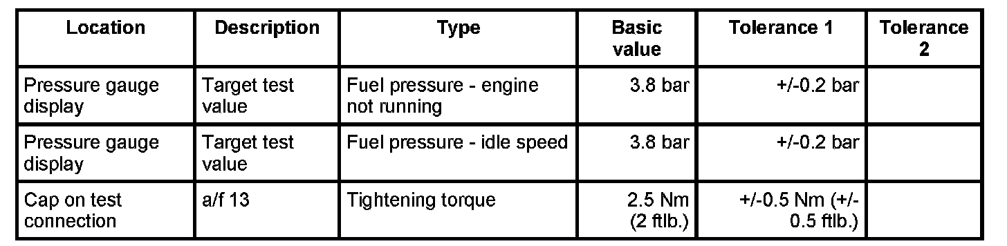 9. Read value on pressure gauge. - Fuel pressure - engine not running: 3.8 bar+/-0.2 bar