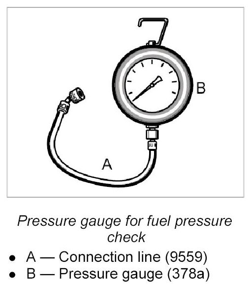 13. Loosen the union nut on the connecting cable 9559 for the pressure gauge 378a on the test connection and remove special tool. Collect escaping fuel with a cloth.