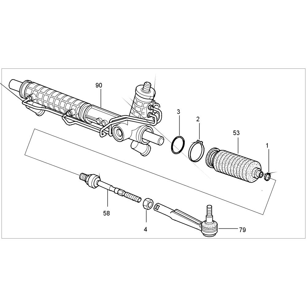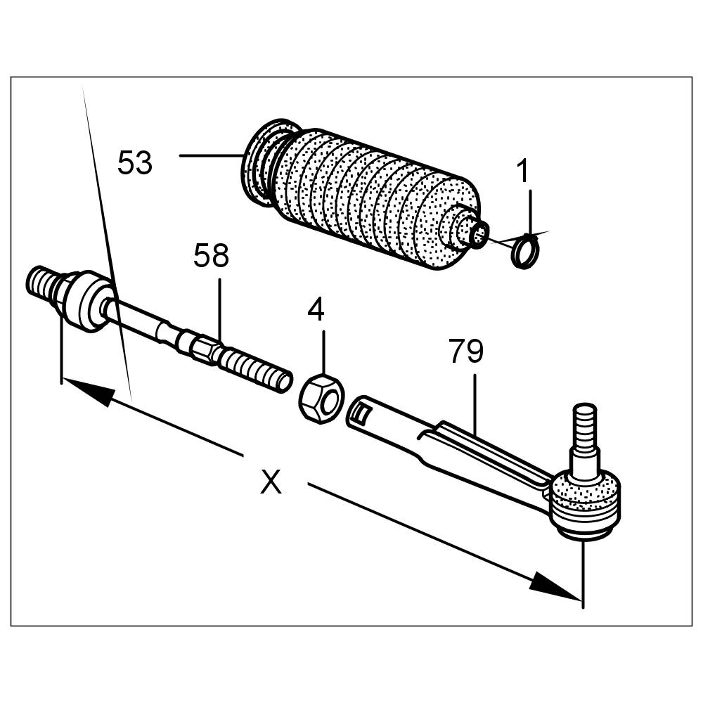 5. Complete tie rod consisting of: new tie rod joint -58- , bellows -53- , small clamping ring -1- , lock nut -4- and tie rod (outer part) -79-. Observe pre-set dimension -X- !