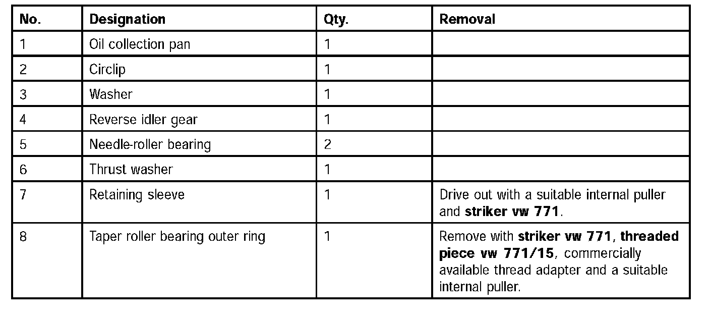 2. Remove outer bearing ring -8- with a suitable internal puller and striker vw 771.
