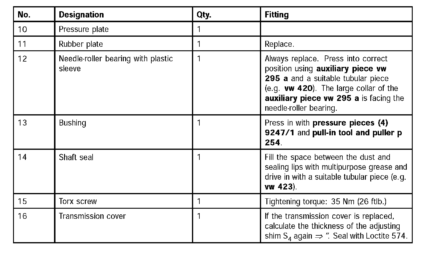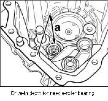 3. Press needle-roller bearing and plastic sleeve -12- into correct position using auxiliary piece vw 295 a and a suitable tubular piece (e.g. vw 420). The large collar of the auxiliary piece vw 295 a is facing the needle-roller bearing. Observe the correct drive-in depth -a = 216-.
