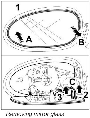 1. Press outside of mirror glass -1- inwards -Arrow A- and pull it out on the inside -Arrow B-.