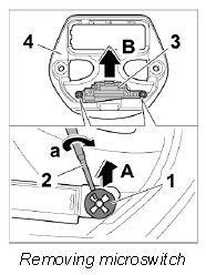2. Remove microswitch for roof -3- from front lock -4- by pulling it upwards -arrow B-.