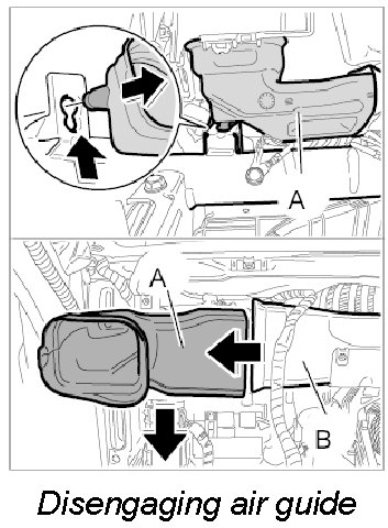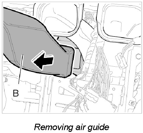 2. Pull the air guide -B- up out of the heater/air-conditioning unit.